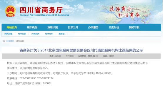 按照《四川省商务厅购买服务比选暂行办法》规定,四川省商务发展事务中心通过四川省商务厅的比选程序,最终被确认为2017北京国际服务贸易交易会四川代表团服务机构。