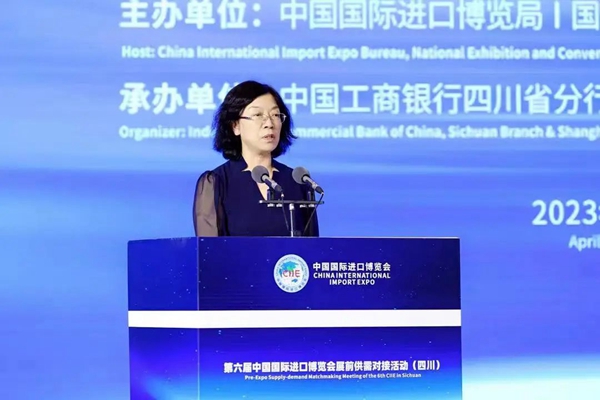 4月20日下午,第六届进博会展前供需对接活动(四川)在成都成功举办。本次活动由中国国际进口博览局、国家会展中心(上海)、四川省商务厅、中国工商银行主办,中国工商银行四川省分行、上海市分行和四川省商务发展事务中心承办。国家会展中心(上海)总裁助理宋尚哲,商务部驻成都特派员付艳,四川省商务厅副厅长陈友清,中国工商银行总行国际业务部副总经理张悦、四川省分行副行长周玥,成都市跨境电子商务协会秘书长姚正毅等出席活动并致辞。